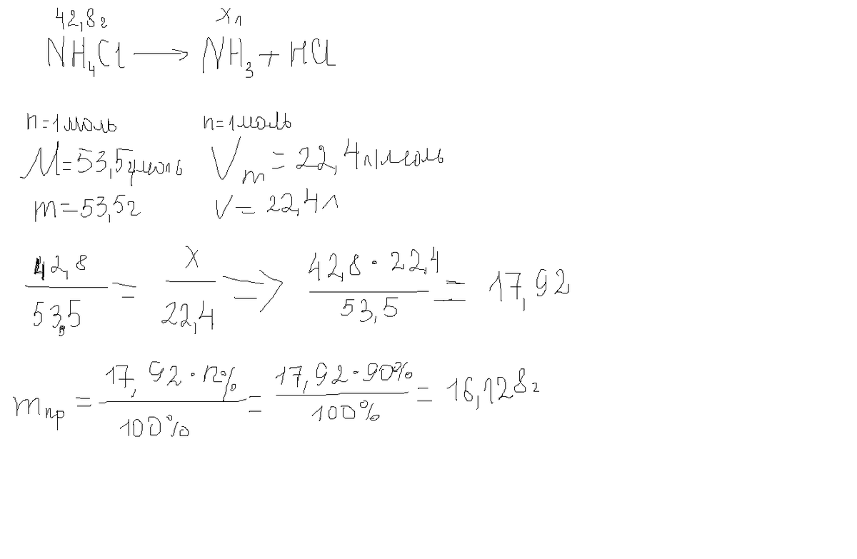 Какой объем (н.у) аммиака может быть получен из 42,8 г хлорида аммония, если выход реакции составляет 90% от теоретически возможного?