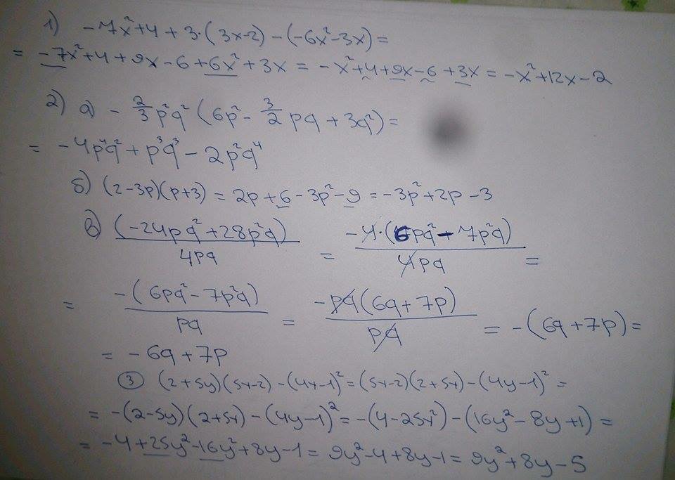 (-7x "во второй степени"+4) +3р(3х-2)-(-6х"вторая степень" -3х) а потом убираешь скобки и решаешь