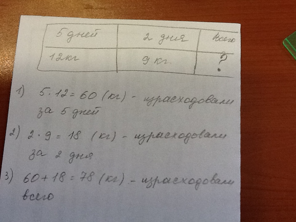 в столовой 5 дней расходовали по 12 кг крупы а 2 дня по 9 кг крупы сколько крупы израсходовали за все эти дни ? запиши задачу в таблице и реши её