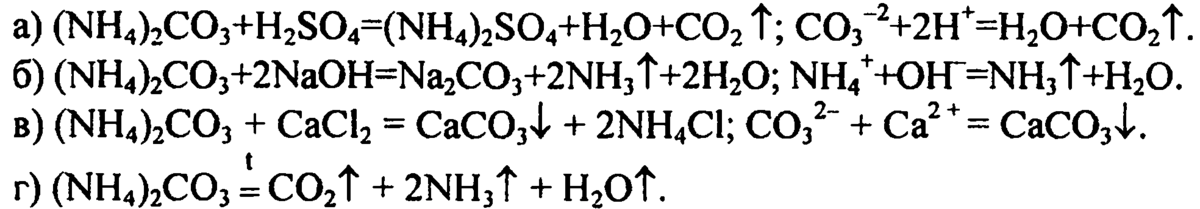 напишите уравнения реакций, характеризующих свойства карбоната аммония: взаимодействие с кислотой, щелочью, солью и реакцию разложения. первые три уравнения запишите также в ионной форме.