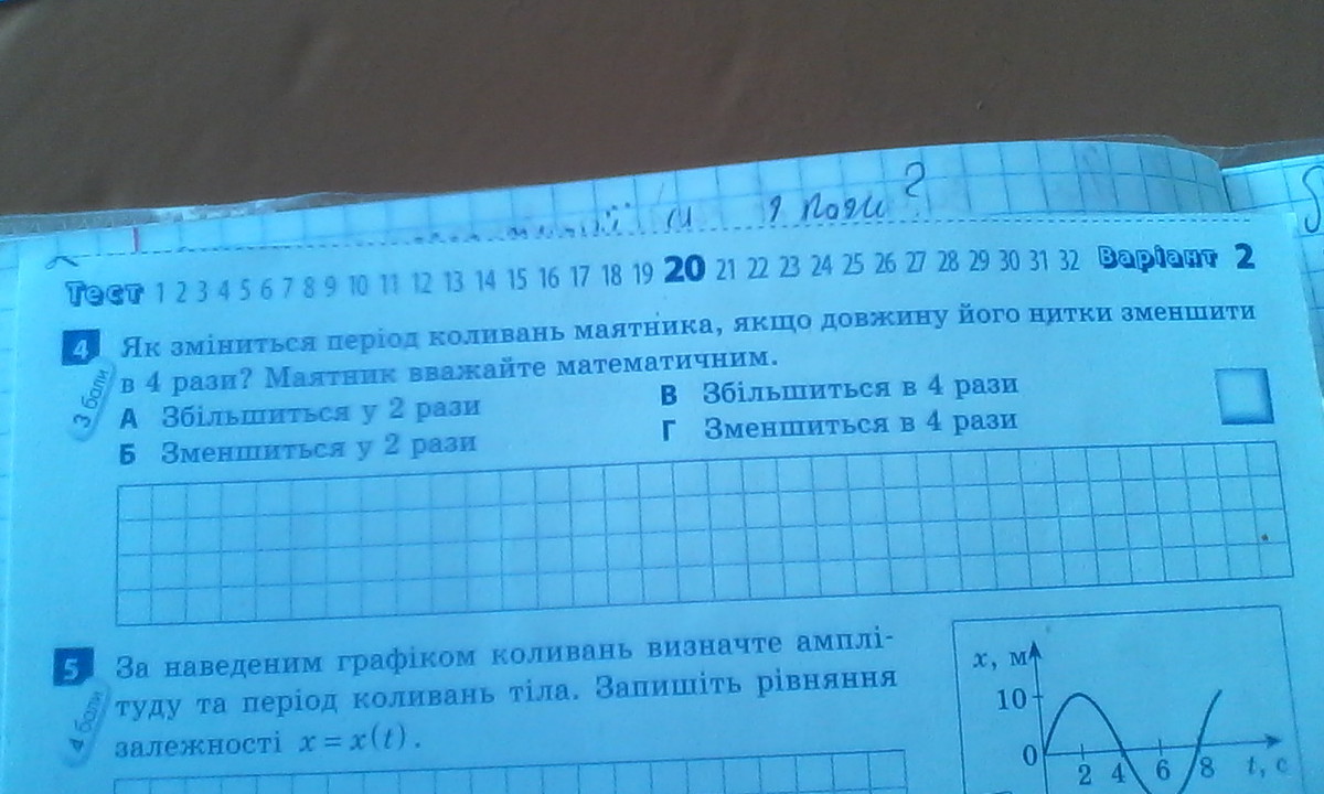 4) У учетом формулы T=2*pi*sqrt(L/g) уменьшится в 2 раза (Б)