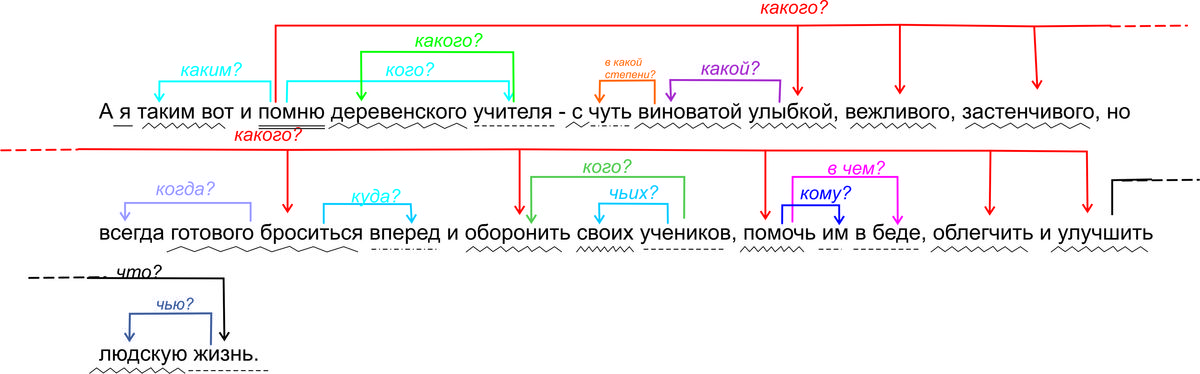 помогите!!!сделать синтаксичеческий разбор. А я таким вот и помню деревенского учителя - с чуть виноватой улыбкой,вежливого, застенчивого, но всегда готового броситься вперед с оборонить своих учеников, помочь им в беде, облегчить и улучшить людскую жизнь.