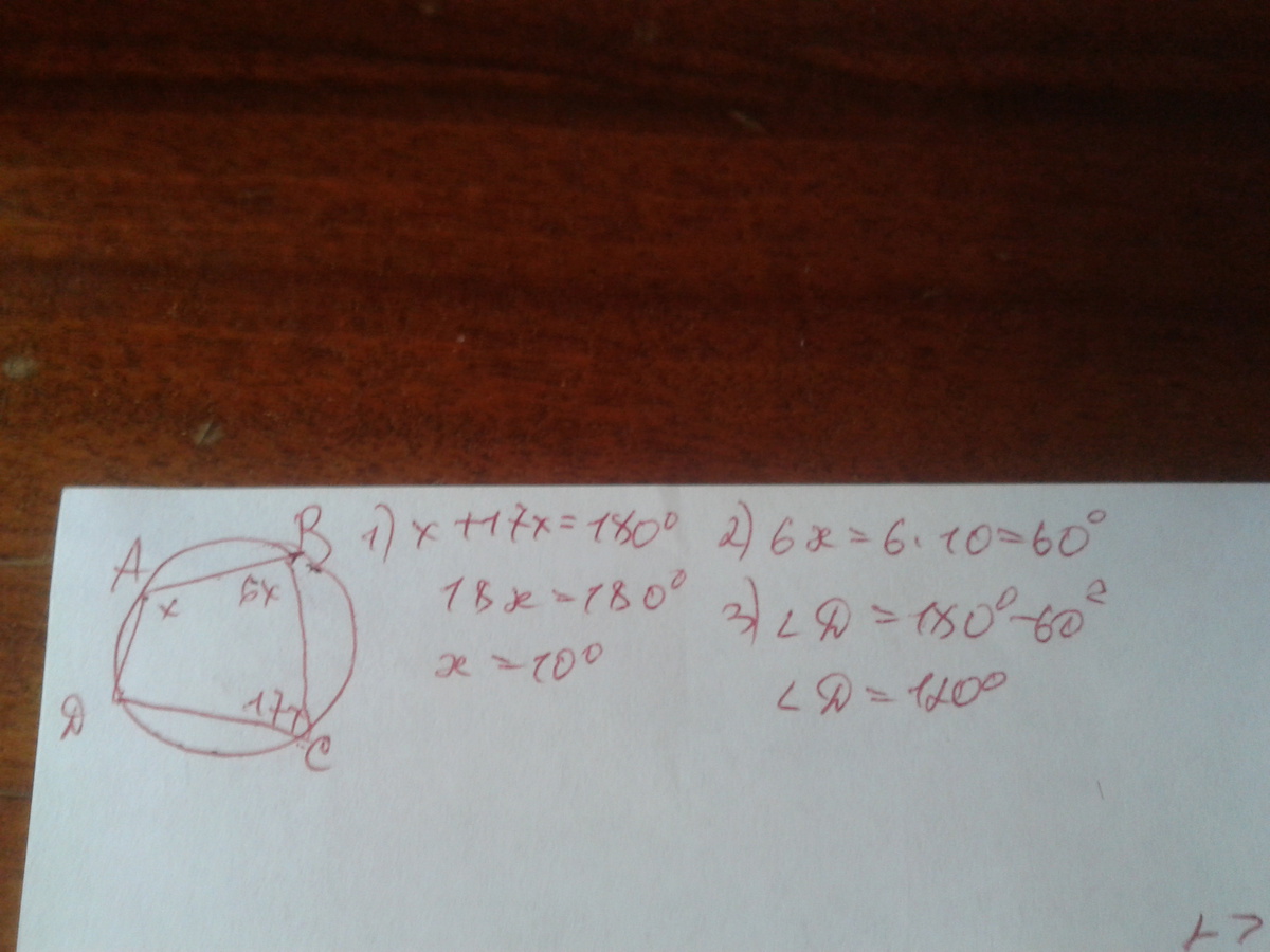 ОЧЕНЬ СРОЧНО!!! 20 ПНКТ!! углы А, В,С четырехугольника АВСД относятся как 1:6:17. найдите угол Д, если около данного четырёх угольгика можно описать окружность. ответ дать в градусах