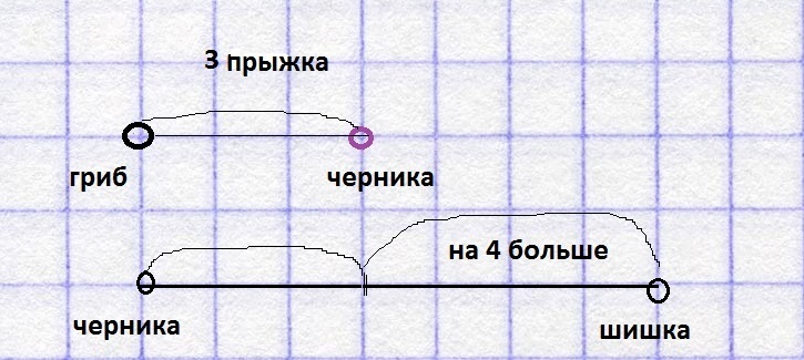 от гриба до чернички воробей сделалт 3 прыжка, а от чернички до шишки на 4 прыжка больше. сколько прыжко воробей сделал от чернички до шишки?