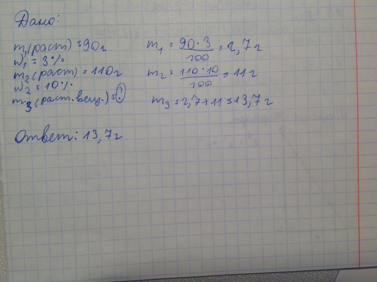 К раствору массой 90 г, содержащий 3% растворенного вещества, прилили 110 г 10%-ного раствора. Вычислить массу растворенного вещества в новом растворе (в г)