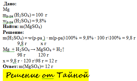 найдите массу соли которая образуется при взаимодействии 100 г 9.8%-ного раствора серной кислоты с магнием