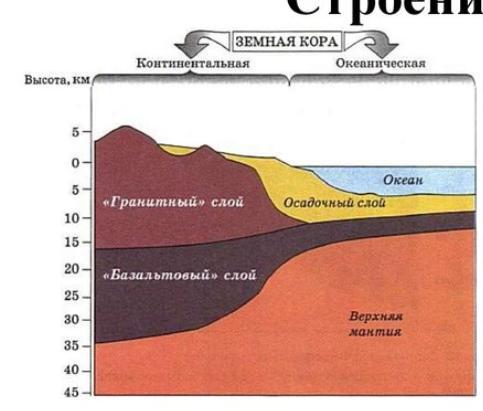 Наименьшую мощность земная кора имеет в районе океана (это океаническая кора), так как под ним у земной коры всего два слоя:осадочный (довольно тонкий) и базальтовый, а гранитный слой отсутствует.А низменности, возвышенности и горы расположены на континентальной коре, где присутствуют все три слоя.