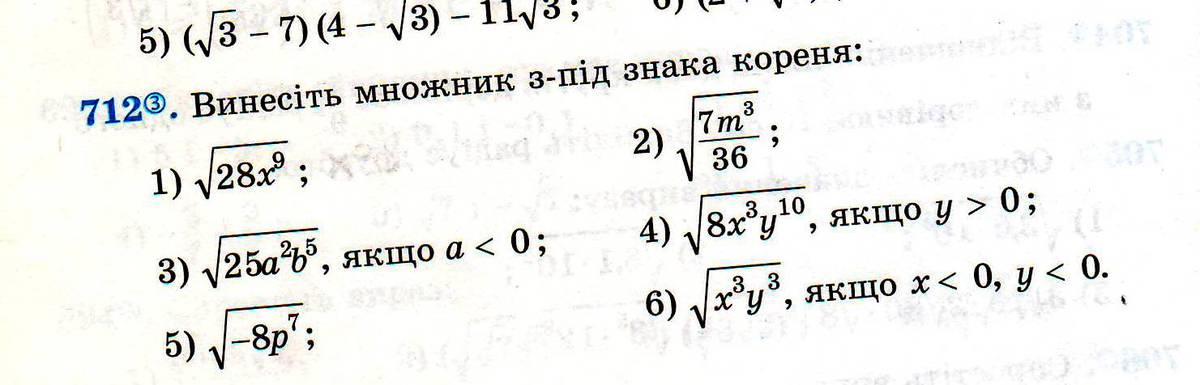 sqrt{28x^9} =2x^4 sqrt{7x}  \  sqrt{ frac{7m^3}{36} } = frac{m^2}{6}  sqrt{7m}  \  sqrt{25a^2b^5} =5|a|b^2 sqrt{b} =-5ab^2 sqrt{b}  \  sqrt{8x^3y^1^0} =2xy^5 sqrt{2x}  \  sqrt{-8p^7}= 2p^3sqrt{-2p}   \  sqrt{x^3y^3} =xy sqrt{xy}