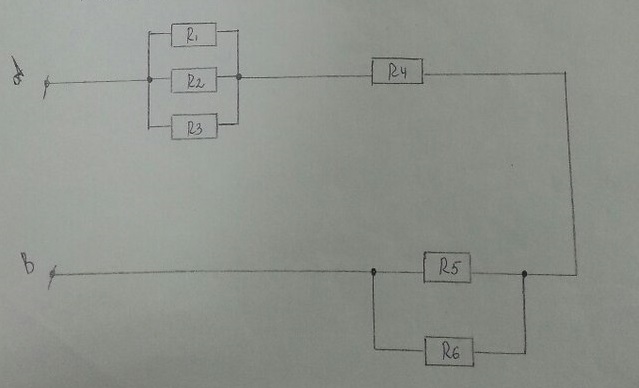 R1=1 Ом, R2=2 ОМ, R3=3 Ом, R4=4 Ом, R5=5 Ом, R6=6 Ом.Общий ток 3.3 А. Определить эквивалентное сопротивление, распределение напряжений и напряжение в сети U АМ.