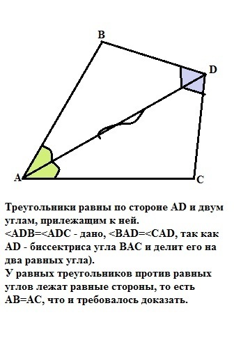 Треугольники ABD и ACD равны по двум углам и стороне между ними (<ADB=<ADC - дано, <BAD=<СAD, так как AD - биссектриса угла ВАС и делит его на два равных угла). Это второй признак равенства треугольников.