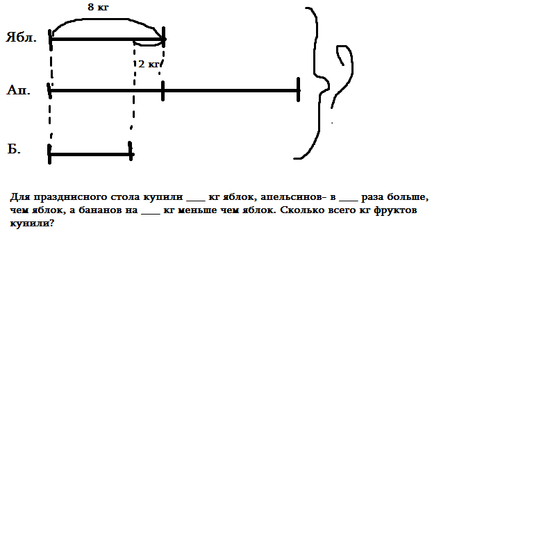 не уверена. яблок 8 кг, апельсинов в 2 раза больше - 16 кг, бананов - 6кг .