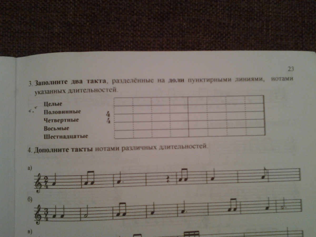 Зополните два такта, разделенные пунктирной линиями, нотами указанных длительностей. (Четыре четверти ) третье задание помогите плииз! Уже на завтра!