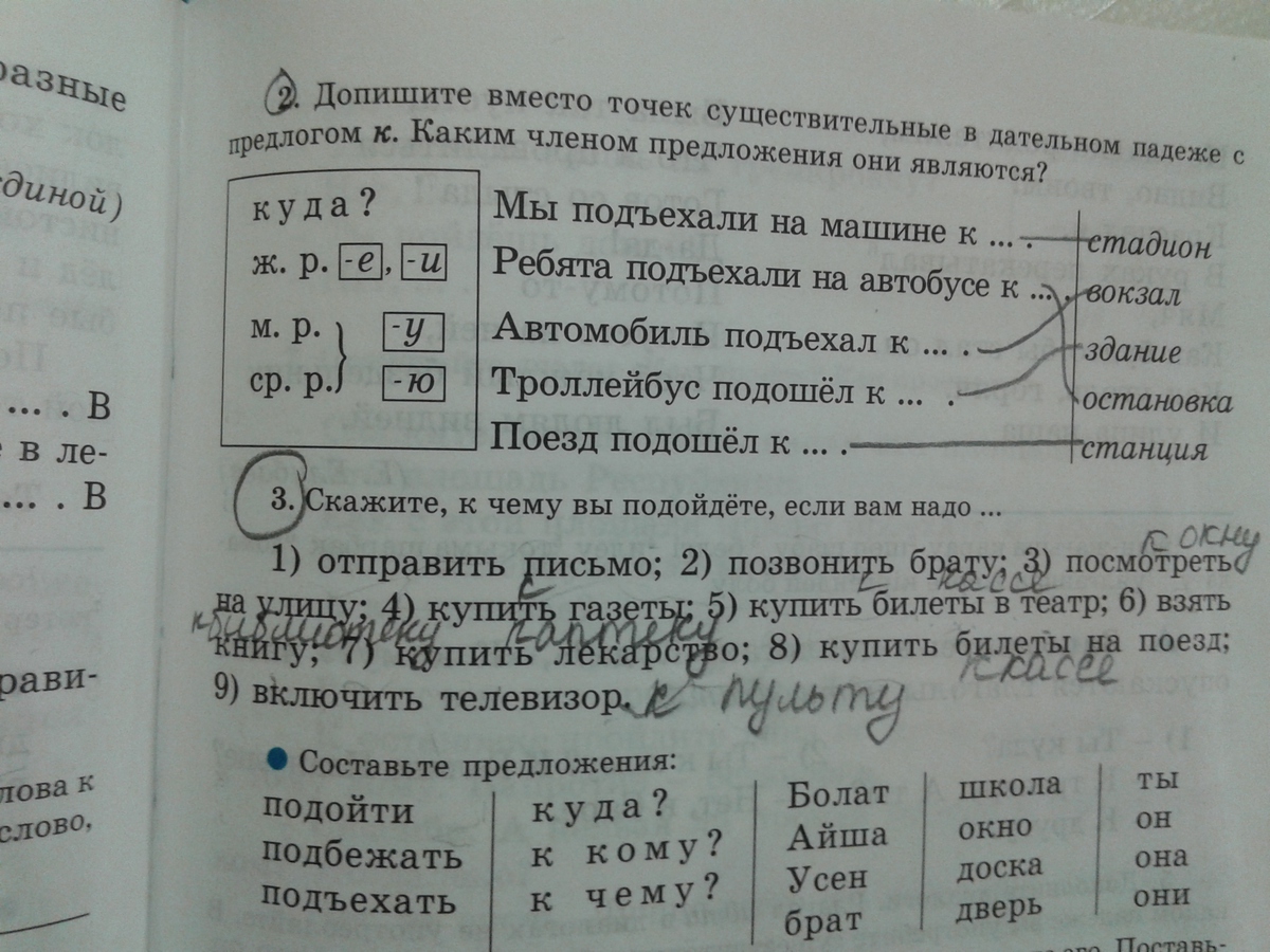 1 .Мы подъехали на машине к стадиону Окончание У2. Ребята подъехали на автобусе к остановке Окончание е3. Зданию окончание ю 4.станции окончание и .