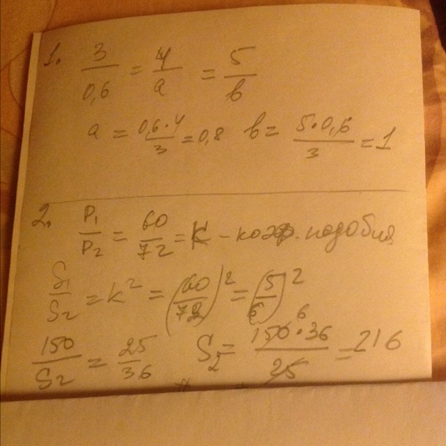 2.Периметры подобных треугольников равны 60 см и 72 см. Площадь первого треугольника 150 см2. Найдите площадь второго треугольника.