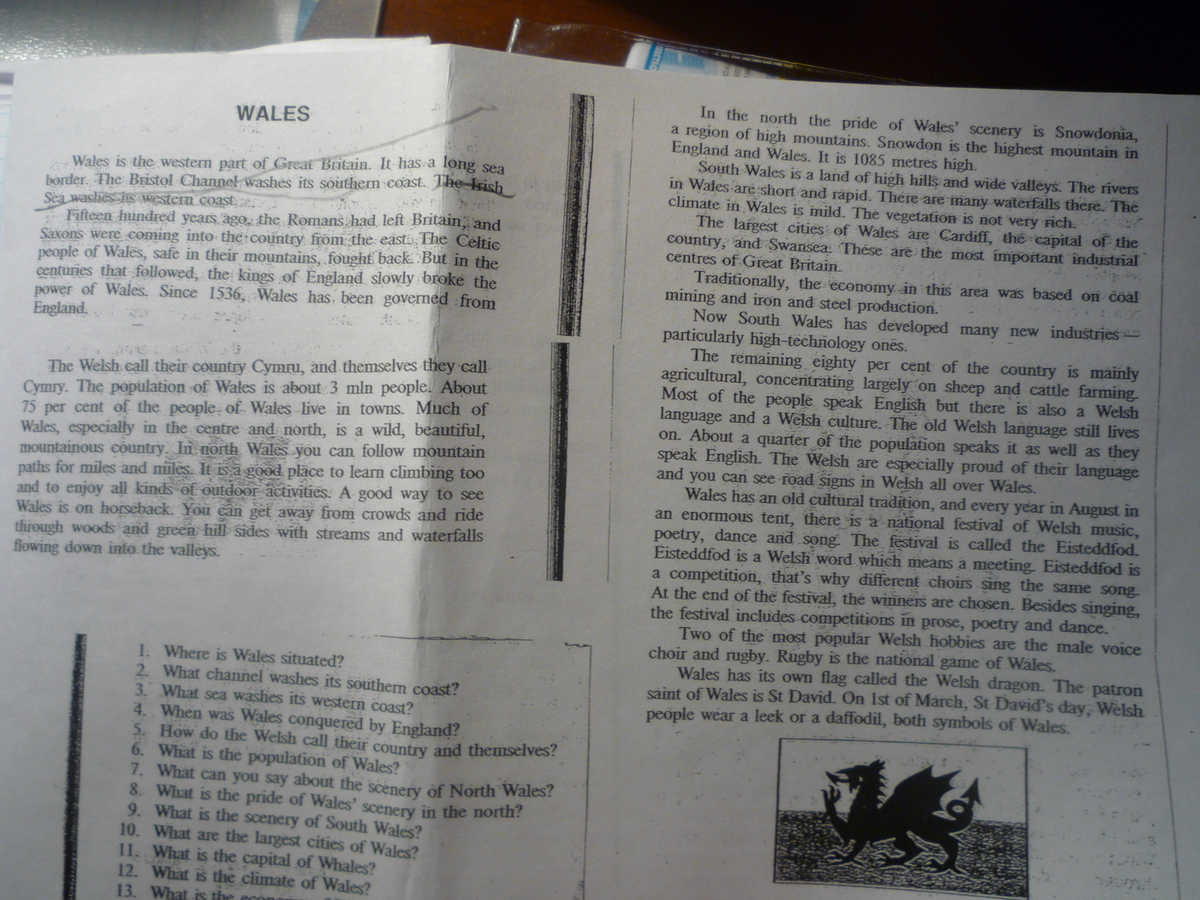 In the north a pride of W. scenery is Snowdonia. South W. is a land of high hills and wide valleys. The climate is W. is mild. The largest cities of W. are Cardiff, the capital of the country, and Swansea. There are the most important industrial centres of GB. Most of the people speak English but there is also Welsh language and a Wersh culture. Wales has an old cultural tradition. Two of the most popular hobbies are the male voice choir and rugby. Rugby is the national game of W. W. has its own flag called the Welsh dragon. The patrron saint of W. is St David. The floral symbol os W. is a daffodil.