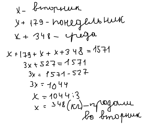 179кг больше чем во вторник, а в среду на 348 больше, чем во вторник?