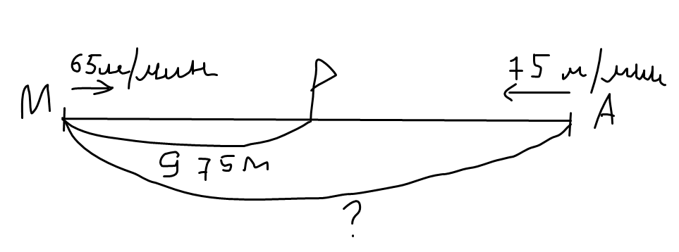 Маша и Алеша вышли из своих домов расположенных на одной улице и пошли навстречу друг другу. Маша шла до места встречи со скоростью 65 м/мин и прошла 975 м. Алеша шел со скоростью 75 м/мин .Нарисуй схему и вычисли расстояние между домами Маши и Алеши.