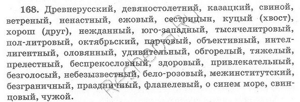 168. Древнерусский, девяностолетний, казацкий, свиной, ветреный, ненастный, ежовый, сестрицын, куцый (хвост), хорош (друг), нежданный, юго-западный, тысячелитровый, пол-литровый, октябрьский, парчовый, объективный, интеллигентный, оловянный, удивительный, обгорелый, тяжелый, прелестный, беспрекословный, здоровый, привлекательный, безголосый, небезызвестный, бело-розовый, межинститутский, безграничный, праздничный, фланелевый, о синем море, свинцовый, чужой.