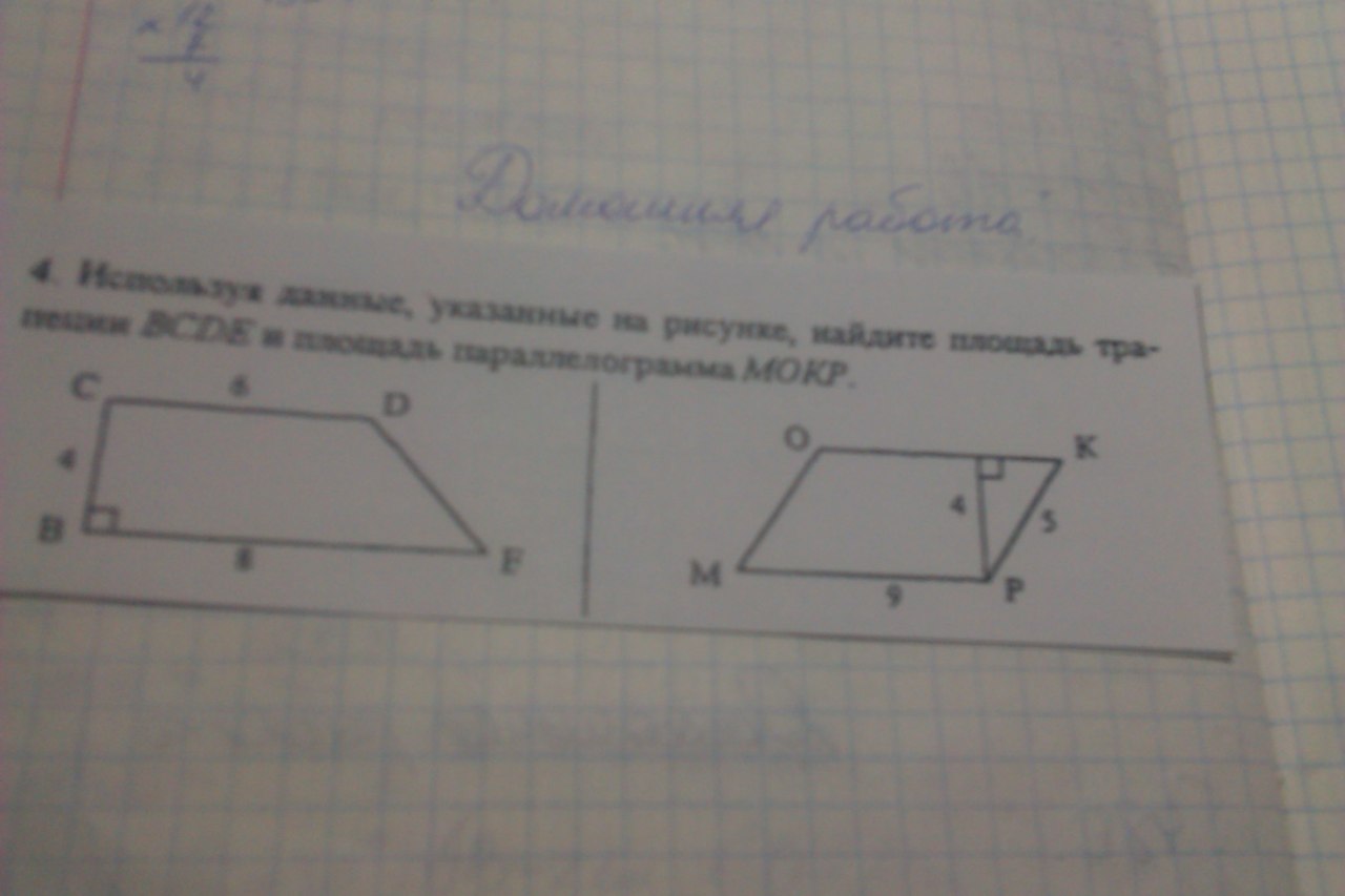 используя данные указанные на рисунке найдите площадь трапеции BCDE и площадь параллелограмма MOKP