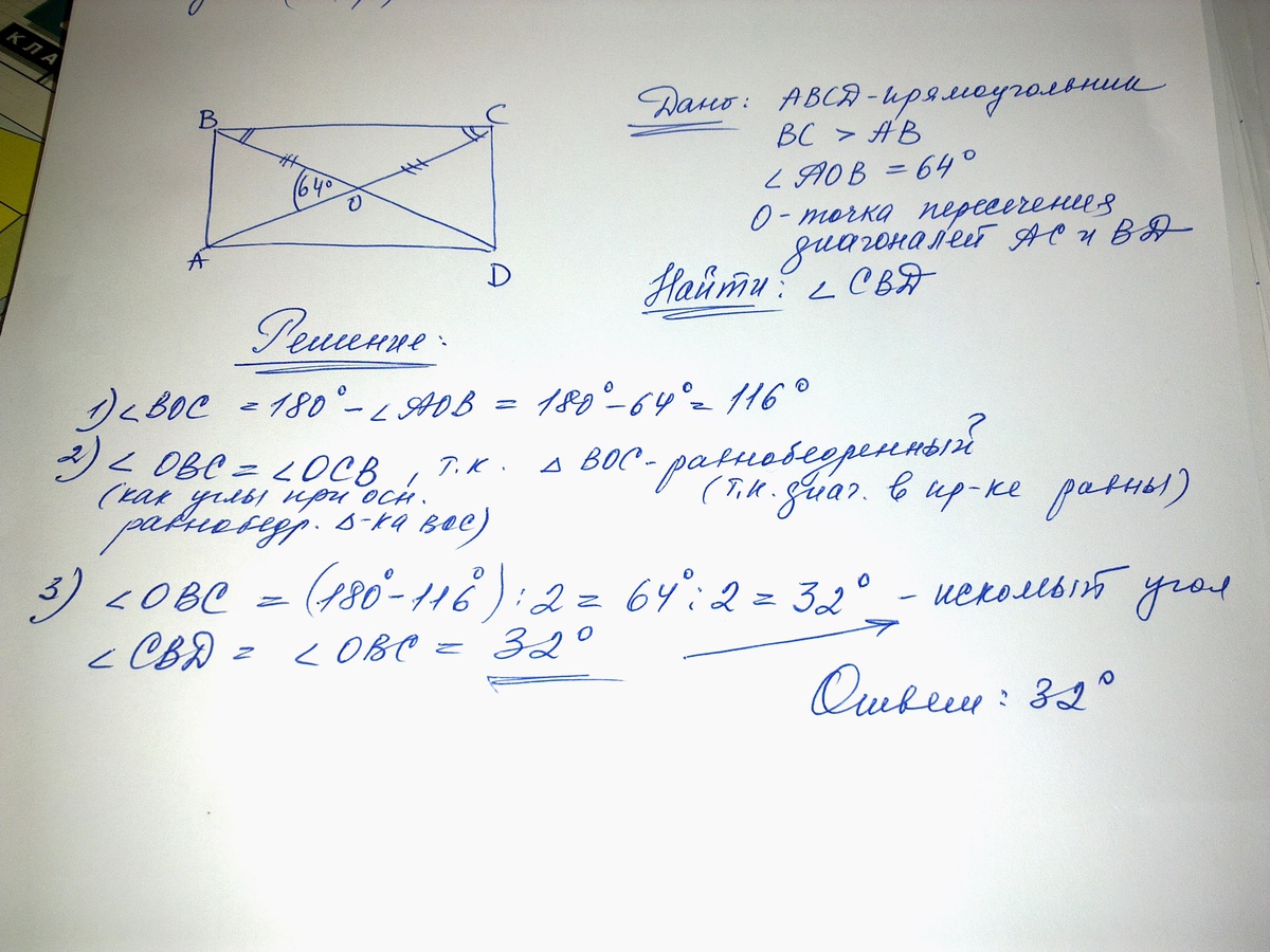 Угол между диагоналями прямоугольника равен 64. Найдите градусную меру угла между большей стороной этого прямоугольника и одной из его диагоналей.