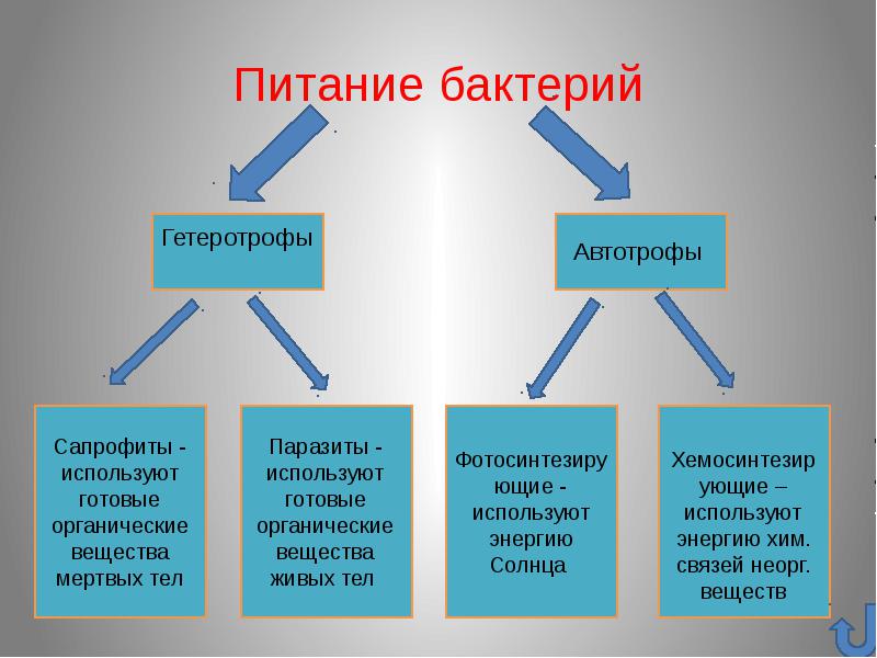 Бактерии питаются готовыми органическими веществами отмерших остатков или живых растений,животных,человека.