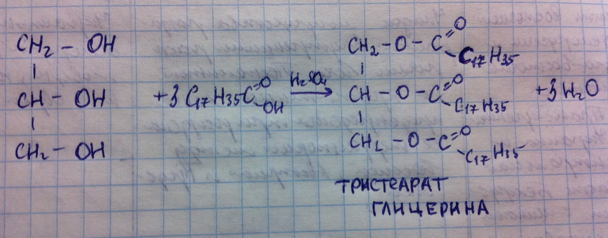 Реакция этерификации трехатомного спирта (глицерина) и одноосновной предельной карбоновой кислоты в присутствии серной кислоты как катализатор.Образуется тристеарат глицерина.
