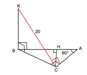 Треугольнк ABC - прямоугольный , угол A = 60 градусов , угол C = 90 градусов. CH - высота треугольника ABC , причем CH = 8 см. Отрезок BK перпендикуляр к плоскости треугольника ABC . Найдите отрезок BK , если расстояние от точки K до стороны AC равно 20 см