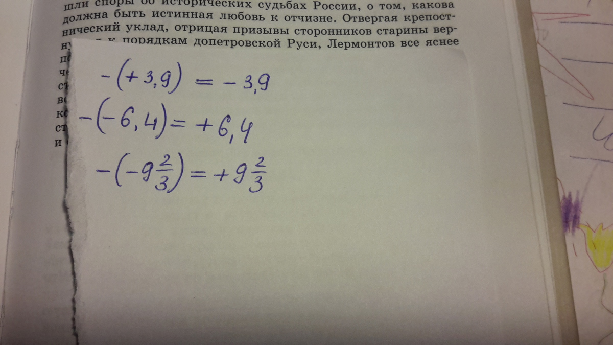 Выполните запись без скобок: а) -(+3,9); б) -(-6,4); в) -(-9 2/3)