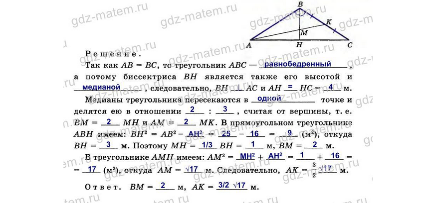 Задача с полным решением. В треугольнике АВС АВ=ВС=5 м. АС=8 м. Медиана АК и биссектриса ВН пресекаются в точке М . найдите ВМ и АК