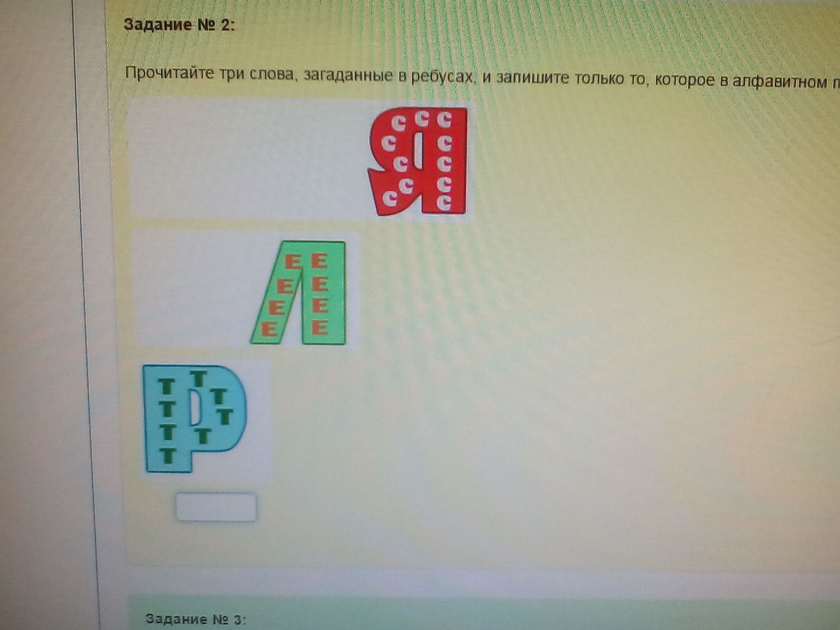 прочитайте три слова загаданные в ребусах и запиши только то которое в алфавитном порядке будет стоять между двумя другими