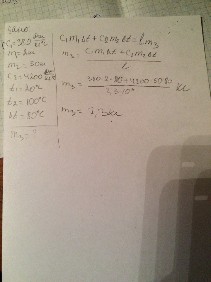 В медном баке массой 2 кг содержится 50 кг воды при температуре 20 С. Какое количество 100-градусного пара следует пропустить через воду в баке, чтобы повысить её температуру до 80 С ?