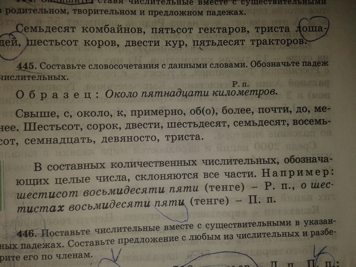 свыше шестисот центнеров (Р.п) , с сорока рублями (Т.п), к двумстам страницам (Д.п), примерно шестьдесят слов (И.п или В.п), о семидесяти учениках (П.п), более восьмисот человек (Р.п), почти семнадцать километров (И.п или В.п), до девяноста килограммов (Р.п), менее трехсот участников (Р.п)