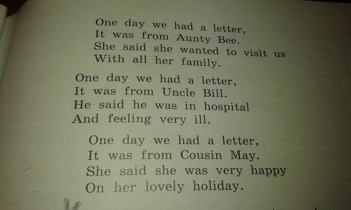 Однажды мы получили письмо, это было от тети Bee. Она сказала, что хочет к нам в гости со всей своей семьей. Однажды мы получили письмо, это было от дяди Билла. Он сказал, что он был в больнице и чувствует себя очень плохо Однажды мы получили письмо, это было от кузена мая. Она сказала, что она была очень счастлива По ее прекрасный праздник.