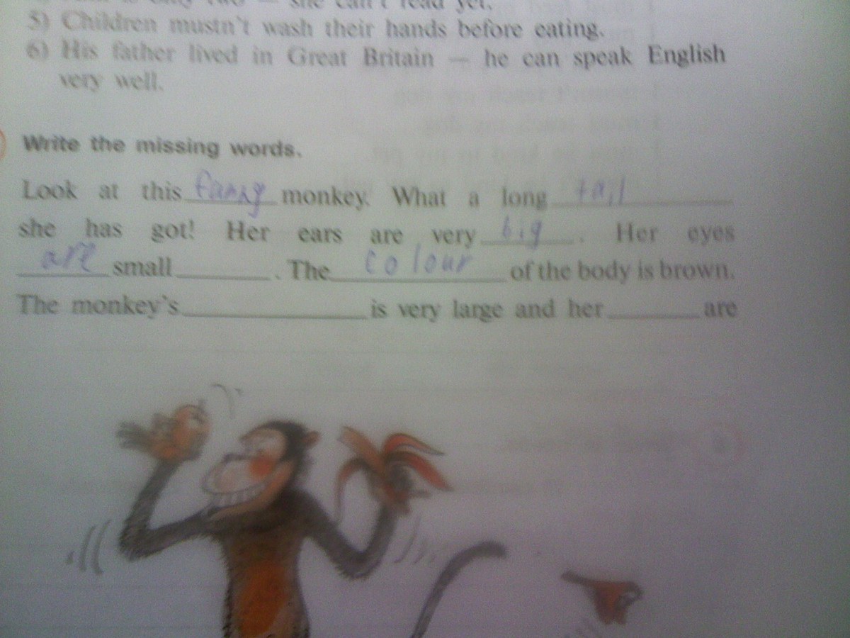 вставить по смыслу слова look at this _____ monkey. What a long_____ she has got! Her ears are very _____. Her eyes ___ small _____. The ______ of body is