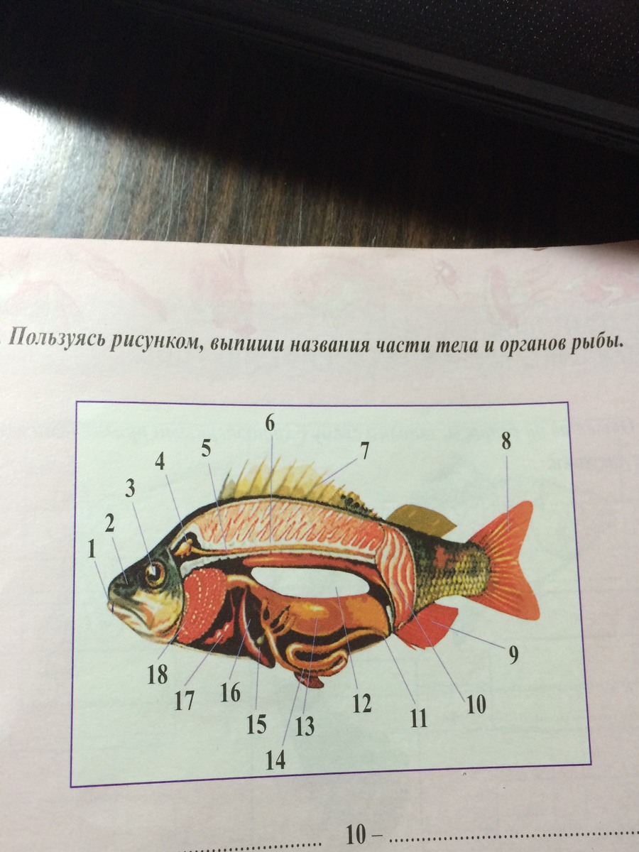 1-рот ,2 нос ,3 глаз ,4мозг ,5 спинной мозг ,6 почка ,7 плавник ,8 хвост ,9 плавник ,10 мочевой пузырь (не уверен плохо видно )11 анальное отверстие ,12 плавательный пузырь ,13 желудок 14 селезенка 15 желчный пузырь ,16 печень ,17сердце ,18жабры .