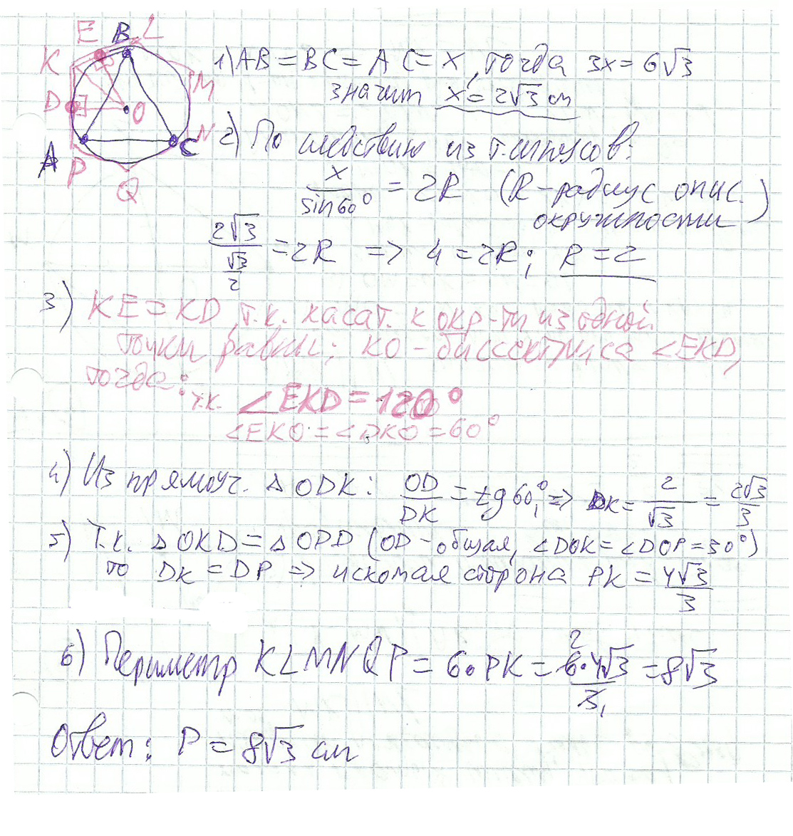 периметр правильного треугольника,вписанного в окружность,равен 6√3 см.найти периметр правильного шестиугольника,описанного около той же окружности