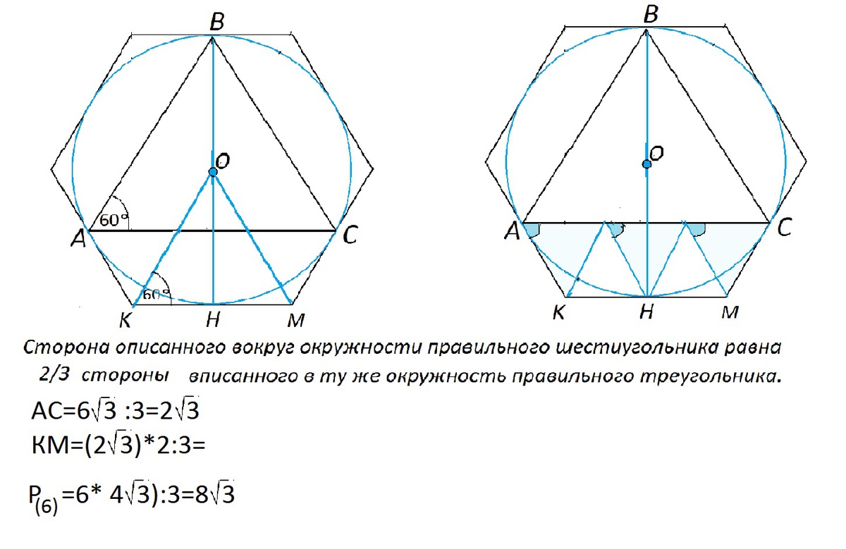 Радиус вписанной в правильный шестиугольник окружности равен радиусу описанной вокруг правильного треугольника окружности.