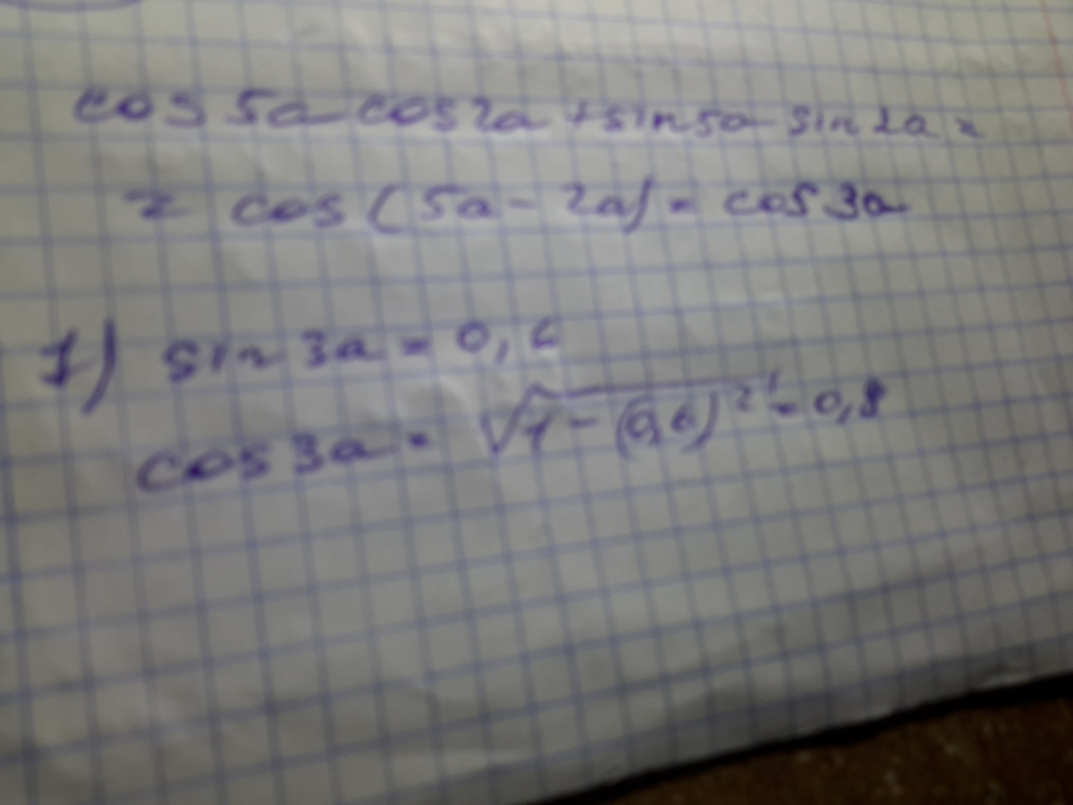 Упростите выражение cos5a cos2a + sin5a sin2a и найдите его значение, если sin3a=0,6 и a принадлежит (pi/6;pi/3) (прим. a - альфа)