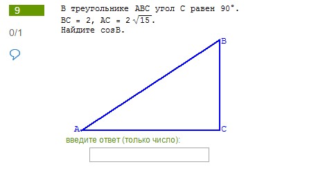 1. sinB=AC/AB, нужно найти АС; АС²=АВ²-ВС²; АС²=625-400=225; АС=15, значит sinB=АС/АВ=15/25=3/5=0.6. 2. cosA=AC/AB, нужно найти АС; АС²=АВ²-ВС²; АС²=625-525=100; АС=10, значит cosA=AC/AB=10/15=2/5=0.4. 3. cosB=BC/AB, нужно найти АВ; АВ²=АС²+ВС²; АВ²=4+60=64; АВ=8, значит соsB=BC/AB=2/8=1/4=0.25.