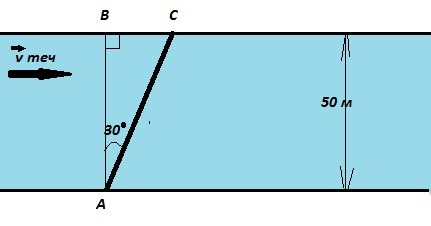 Лодка плывет поперек реки шириной 50 м. Течением реки лодку сносит под углом 30º к берегу. Определите результирующее перемещение лодки с берега на берег