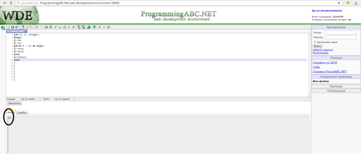 Если вам надо "прогнать" программу и у Вас нет программы, то идите хотя бы в web-среду что ли... Вывод будет " 55 "...