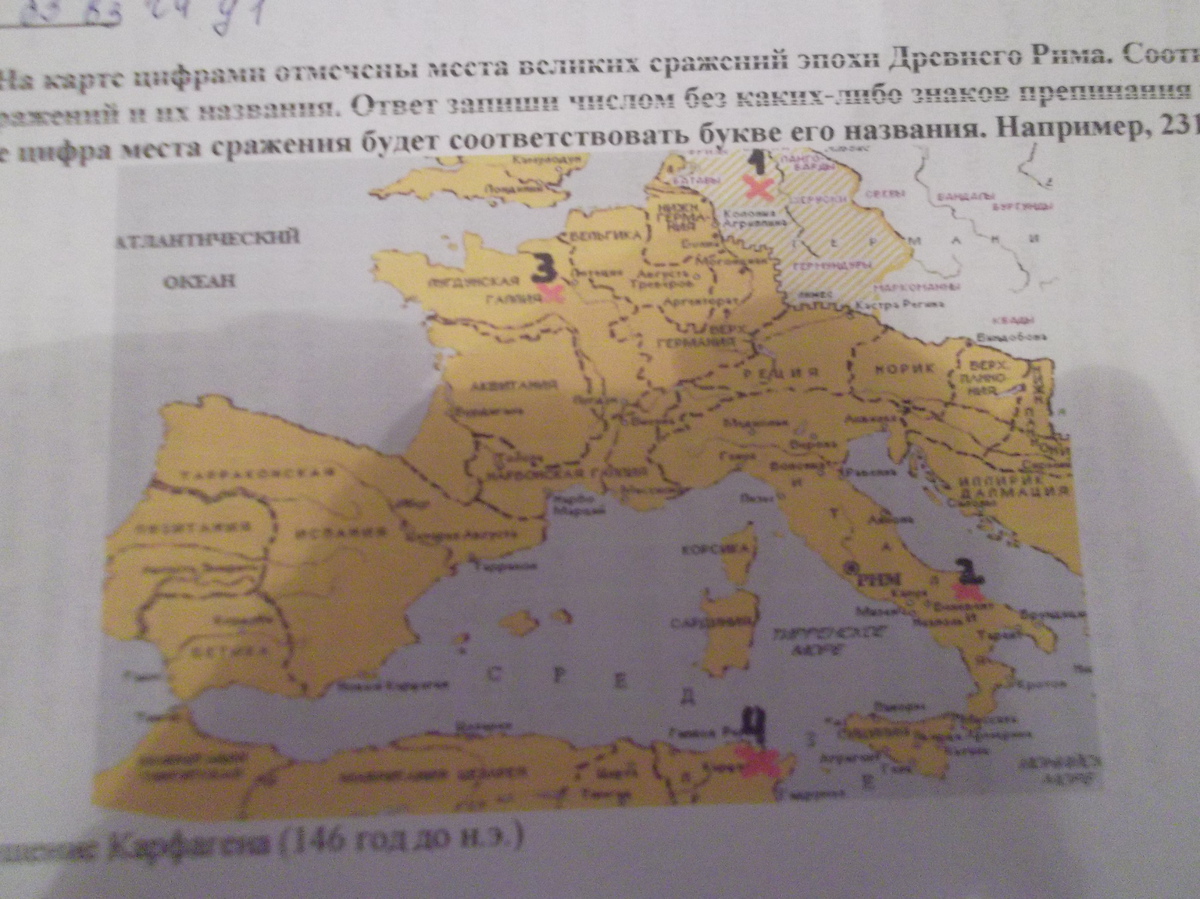 на карте цифрами отмечены места великих сражений эпохи древнего рима .соотнеси места этих сражений и их названияю а)осада и разрушение карфагена (146год до г.э.)бЩ)битва при каннах(216год до н.э.) в)битва в тевтобурском лесу (9 год до н.э)г) битва на каталаунских полях(451год до н .э)