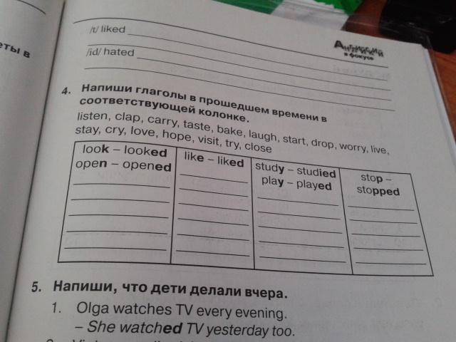 Нужно написать глаголы в прошедшем времени в соответствующей колонке.