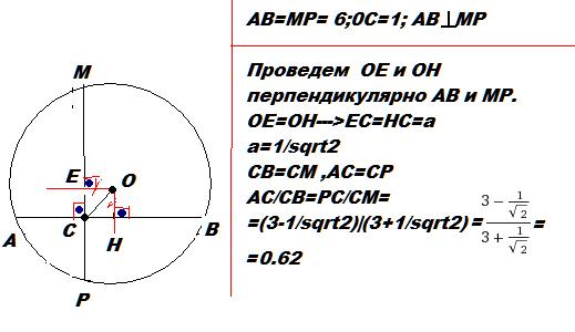 На расстоянии 1 см от центра пересекаются две хорды. Они взаимоперпендекулярны и каждая из них равна 6 см. Найдите отношение длин отрезков на которые одна хорда делит другую.