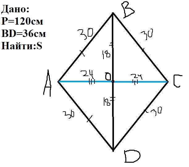 1)У ромба все 4 стороны равны, а т.к периметр равен 120 см, то сторона ромба равна 120:4=30 см.
