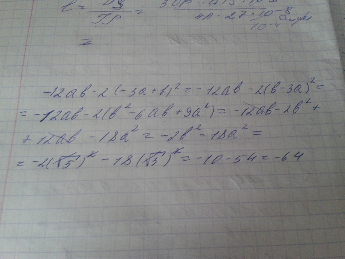 -12ab-2(-3a+b)^2. При a= корень из 3;b=корень из 5.Решите пожалуйста очень надо(