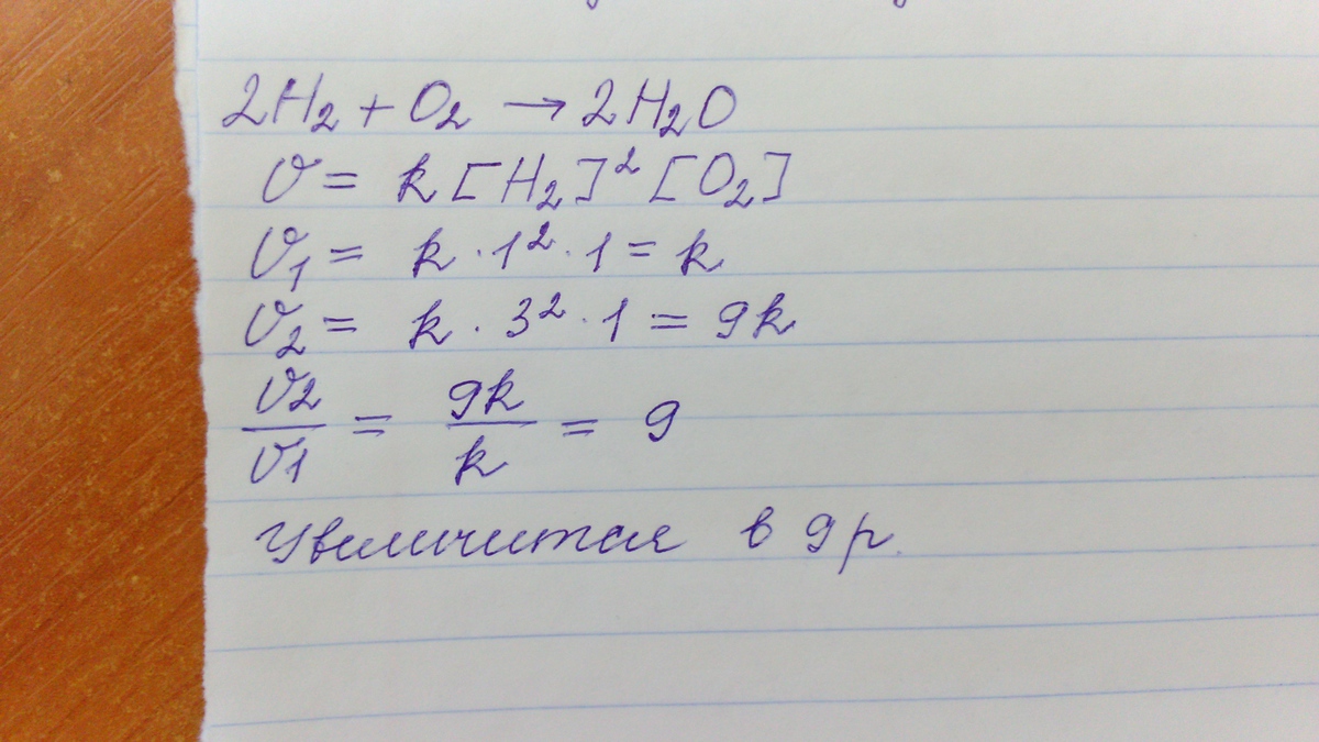 31. Горение водорода сопровождается образованием парообразной воды: 2Н2(г) + О2(г) = 2Н2О (п). Написать выражение скорости данной реакции согласно закону действия масс. Определить, как изменится скорость реакции, если увеличить концентрацию водорода в 3 раза?