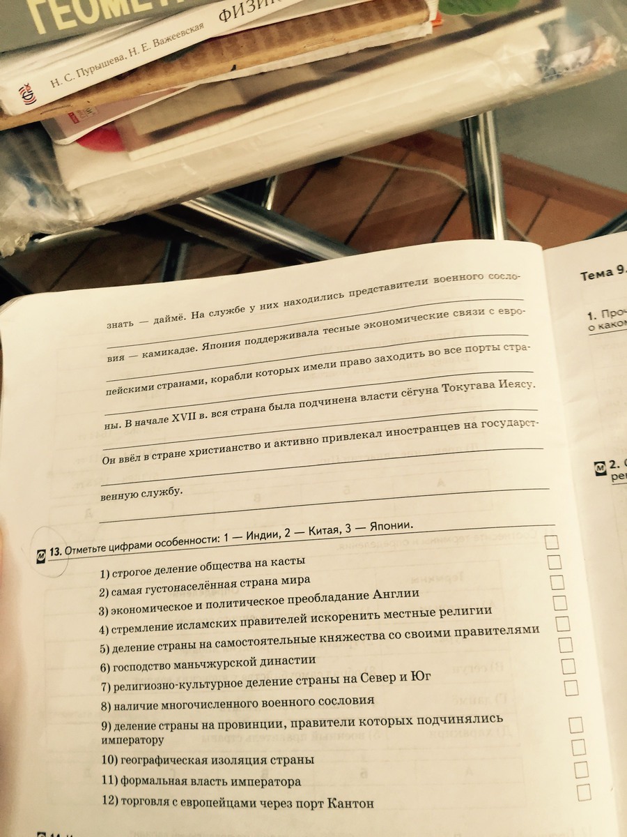 12.Япония расположена на островах к востоку от Китая, поэтому испытывала его культурное влияние. Религией большинства японцев был синтоизм. Вся власть в Японии принадлежала императору. Военные правители – сёгуны – только выполняли волю императора. Высшее положение в обществе занимала Знать – даймё. На службе у них находились представители военного сословия – самураи. Япония поддерживала тесные экономические связи с европейскими странами, корабли которых имели право заходить во все порты страны. В начале XVII в. вся страна была подчинена власти сёгуна Токугава Иеясу. Он ввёл в стране репресси против христян и все контакты с иностранцами были ограничены.