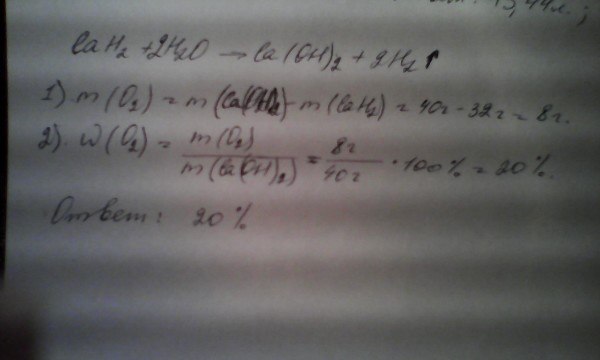 Вещество CaH2 массой 32 гр.вступило в реакцию с водой.После реакции осталась твердая масса в 40гр.Определите массовую долю кислорода в твердой массе в %.