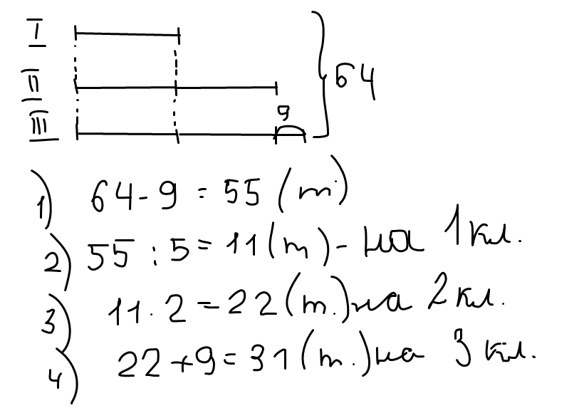 На трех клумбах высадили 64 тюльпана. На второй клумбе высадили в 2 раза больше тюльпанов, чем на первой и на 9 тюльпанов меньше, чем на третьей